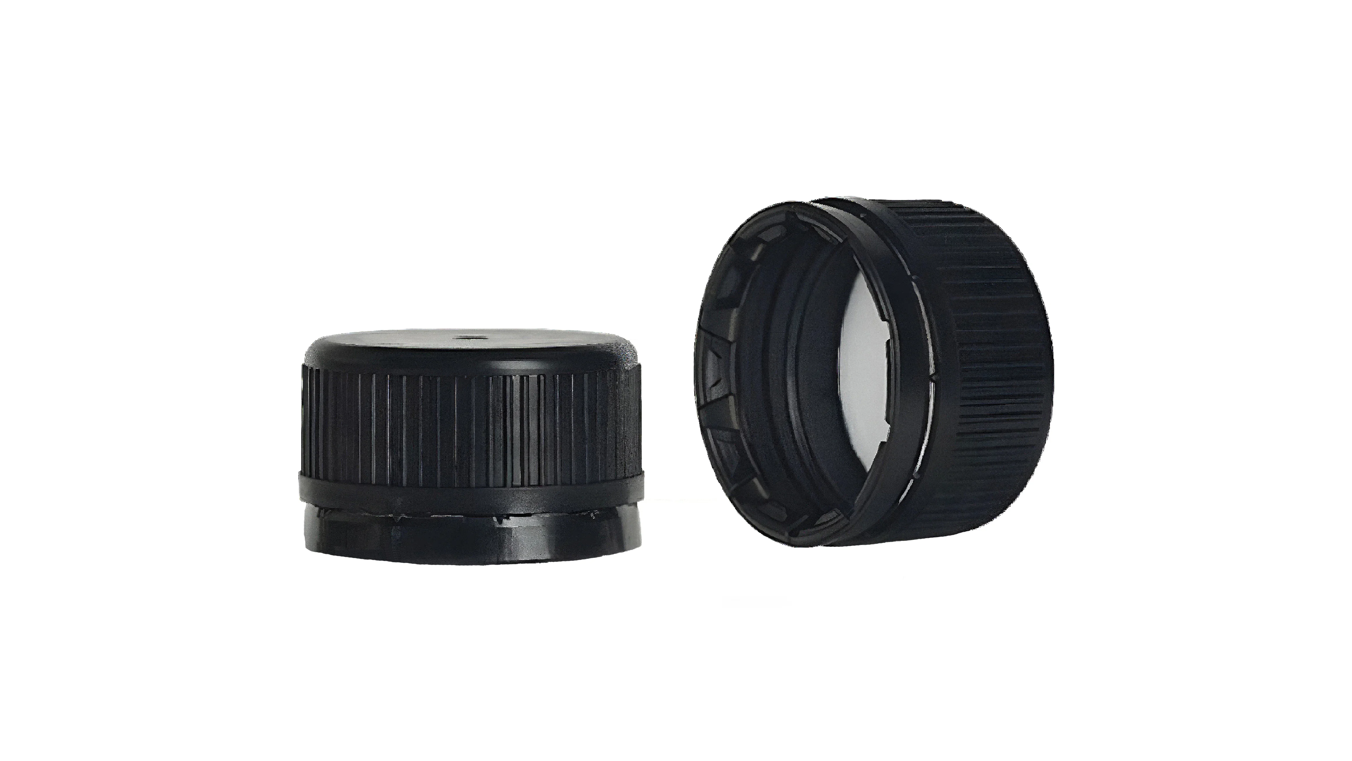 Safety cap made of durable plastic in black color, featuring a preformed thread and an integrated tamper-evident ring.